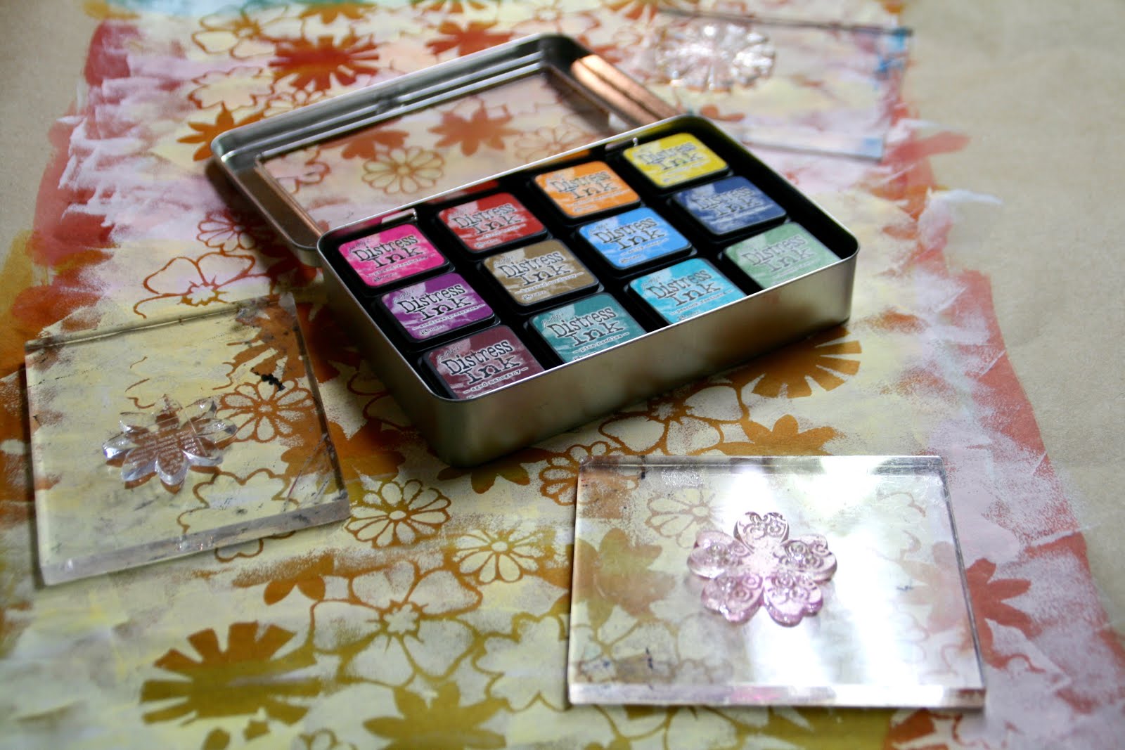 Using only some brown parcel paper, the ARTplorations Big Bloom Factory large stencil and matching Big Bloom acrylic stamps, Ranger distress inks and stains and some white gesso I created this colourful paper in three easy steps...
