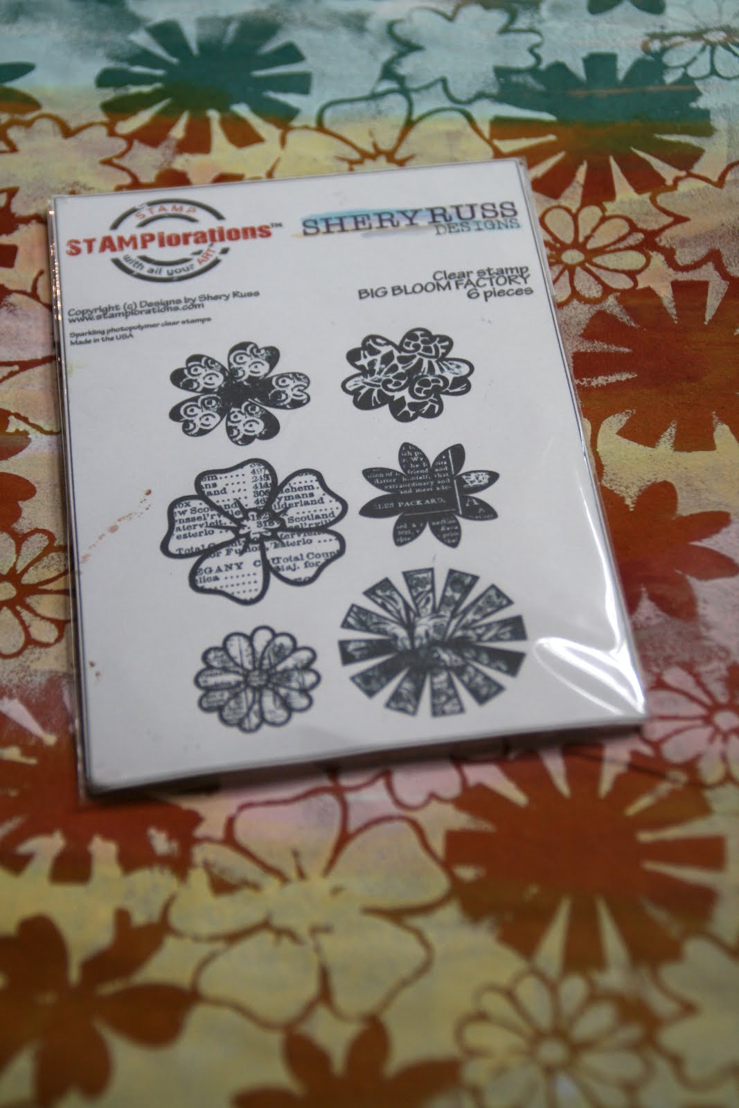 Now I could have stopped here and used this paper the way it is but I wanted something more, so I decided to add some stamped details to the pattern using the STAMPlorations matching Big Bloom Factory photopolymer stamps.