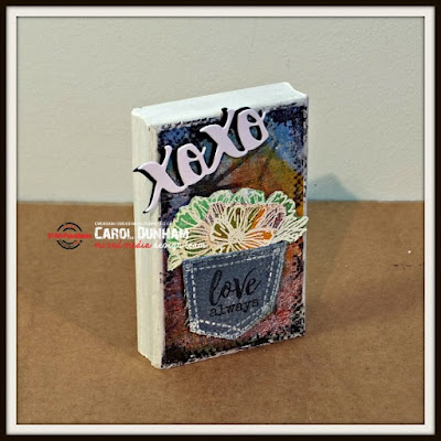 I used the Pocket Blooms with Pocket Die set to decorate the front....the pocket was cut from a piece of denim, then stamped and heat embossed. The flowers were stamped several times onto a piece of the leftover Gelli print and heat embossed, then layered. I cut the XOXO word die from both black and white card and off set them slightly.