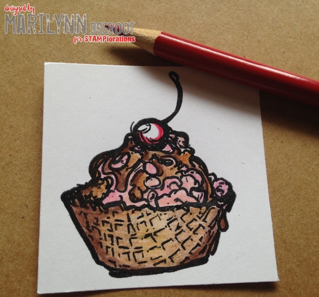 Next I colored the ice cream image. I used cheap coloring pencils to show you that you don't need to spend a lot of $ to get a great result. I picked 3 shades of brown, 1 pink, 1 peach and 2 shades of red.