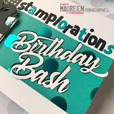 Next, I cut the Birthday Bash phrase in both black and white, and glued the white one on top, offset just a bit to the right. This gives it a drop shadow effect. From here, I cut the word "stamplorations' out of the Lowercase Alphabet die, gluing to the front, alternating black with some turquoise. It's a great way to personalize your invitations with the guest of honor's name!